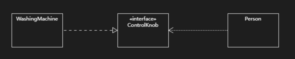 - 可以发现使用接口的表达方式与依赖一样,可以理解为:“人”需要通过“控制旋钮”才能使用“洗衣机”,因此“人”依赖于“控制旋钮”。