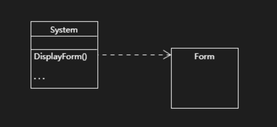 当在一个类中使用了另一个类时,我们称之为依赖。依赖用 虚线 连接,用 尖箭头 指向依赖的目标。比如,一个“系统(System)”的“显示表单(DisplayForm)”功能依赖于“表单类(Form)”: