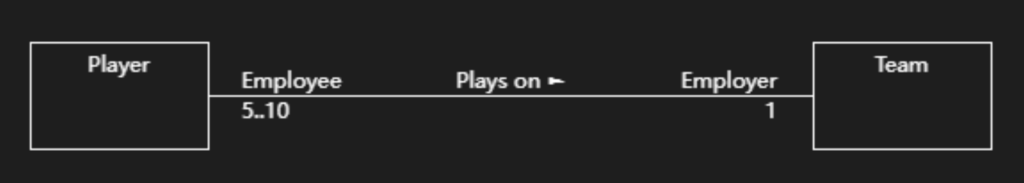 这样的一幅图表达的内容是:“队员(Player)在球队(Team)打球。且队员是雇员(Employee),球队是雇主(Employer)。一个球队可以有5~10个队员”。当然,“队员”和“球队”代表的程序中的两个类。你看懂了吗?没看懂的话没关系,接着对上图进行分解解释: