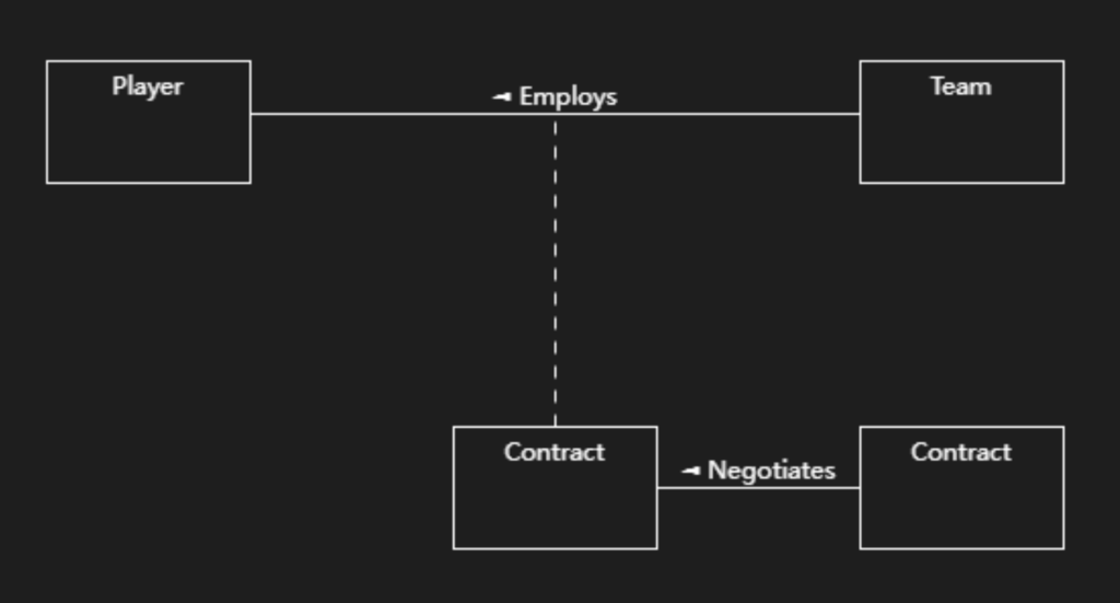 和类一样,关联也可以有自己的属性和操作,这样的关联称为 关联类(association class) 。比如:“队员”和“球队”之间的关系是通过“合约(Contract)”关联起来的,而合约的签订由“总经理(GeneralManager)”商定(Negotiates),因此我们可以用UML表达这样的关联,如下所示: