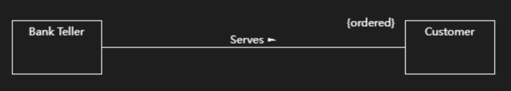 开始有提到过“关系之间是存在约束的”,因此关联也有这样的表达。比如:“银行柜台服务员(Bank Teller)为顾客(Customer)服务(serve),但是服务的顺序要按照顾客排队的次序进行”,此时UML可以如下表示: