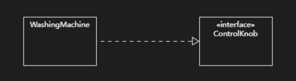 类由属性和方法(接口)组成,实现表达的就是类与接口间的关系。UML用虚线连接类和接口,并用 空心箭头 指向接口,比如,“洗衣机(WashineMachine)”实现了“控制旋钮(ControlKnob)”: