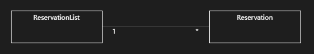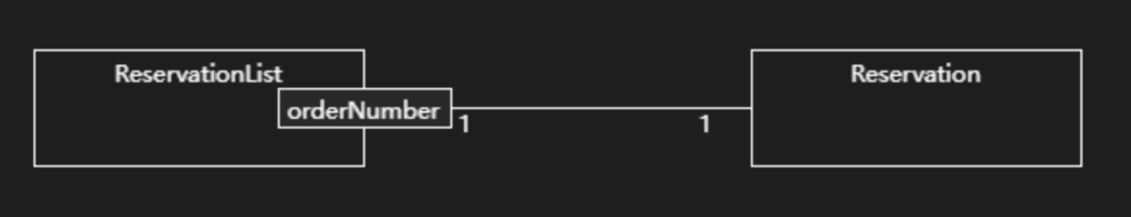 如上所示,“房间预订列表”与“预订信息”是1对n的关系,通常一个“预订信息”会对应唯一的一个“订单号(orderNumber)”用于“房间预订列表”查询条件,其UML表示如下: