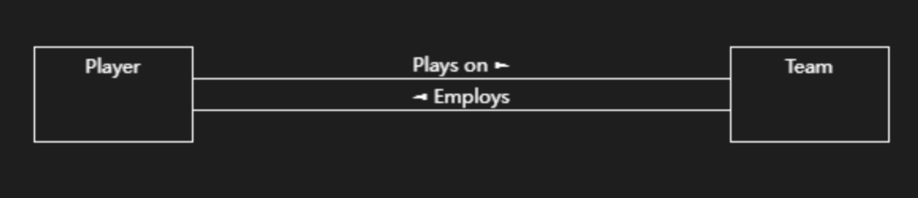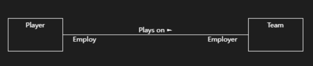先陈述第一句话“队员在球队打球”,这句话表达出了队员和球队之间的联系。那么在UML中可以如此表达,开始可以先说明“队员”和“球队”之间存在关联,这里用一条直线表示。从句子中不然发现“队员“是关系的发起者,因此在关联线的中间用箭头表示这样的关系,同时在方向后方添加描述“Plays on”来对该方向做进一步解释,最终就表达出了我们要的意思了,如下图所示: