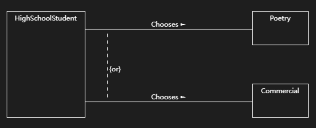 约束关系还有一种是“Or(或)”,比如:“大学生(HighSchoolStudent)选修课可以选择诗歌(Poetry)或商务(Commercial)”,UML可以如下表示: