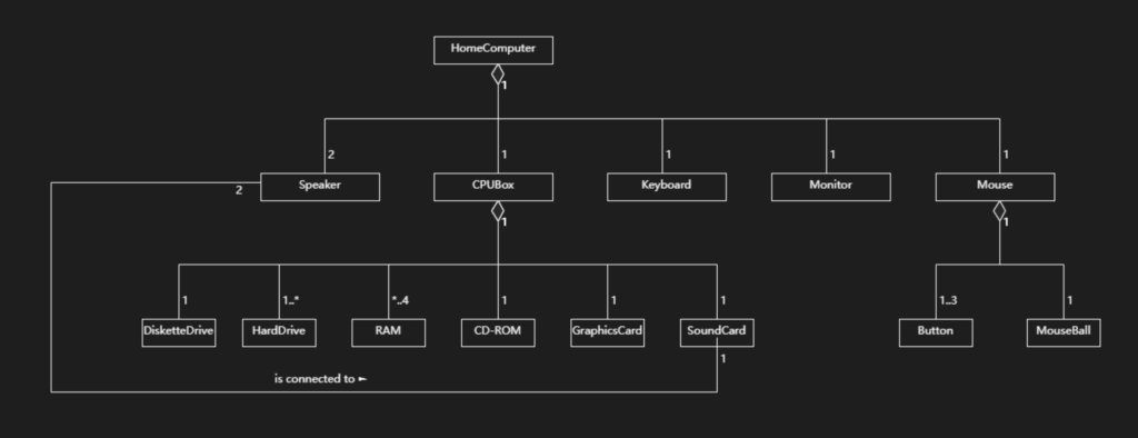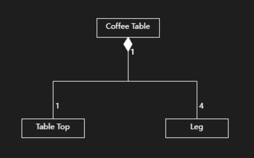 - 整体和部分之间用 实线 连接,且用 空心菱形箭头 指向整体。