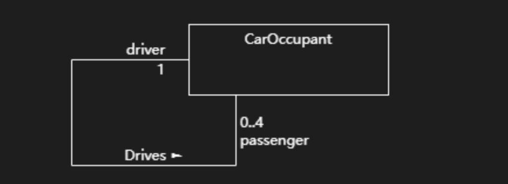 比如,一位“车上的人(CarOccupant)”既可能是一位“司机(driver)”,也可能是一位“乘客(passenger)”,那么一个司机可以搭载0到4位乘客,因此其UML表达为: