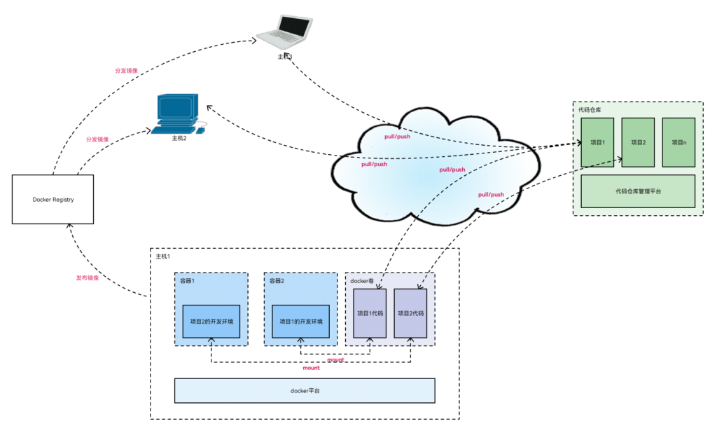 - 用于开发项目的终端设备。用户在主机设备上运行Docker并创建好开发环境后,通过pull指令从“代码仓库管理平台”上获取代码并进行项目开发,在开发过程中通过push指令更新仓库代码。