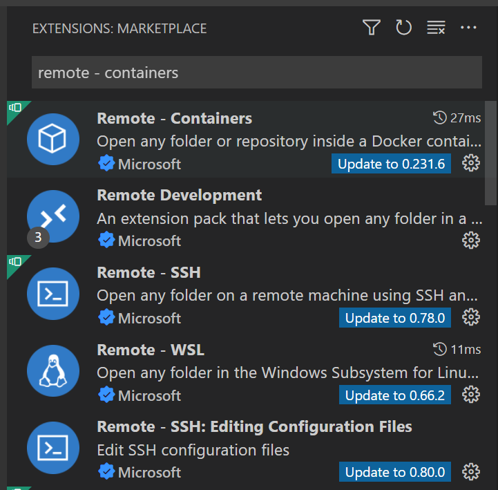打开vscode并安装插件:“Remote - Containers”(建议直接安装“Remote Development”,随着对remote开发越来越熟练后,里面的功能都会用上的):