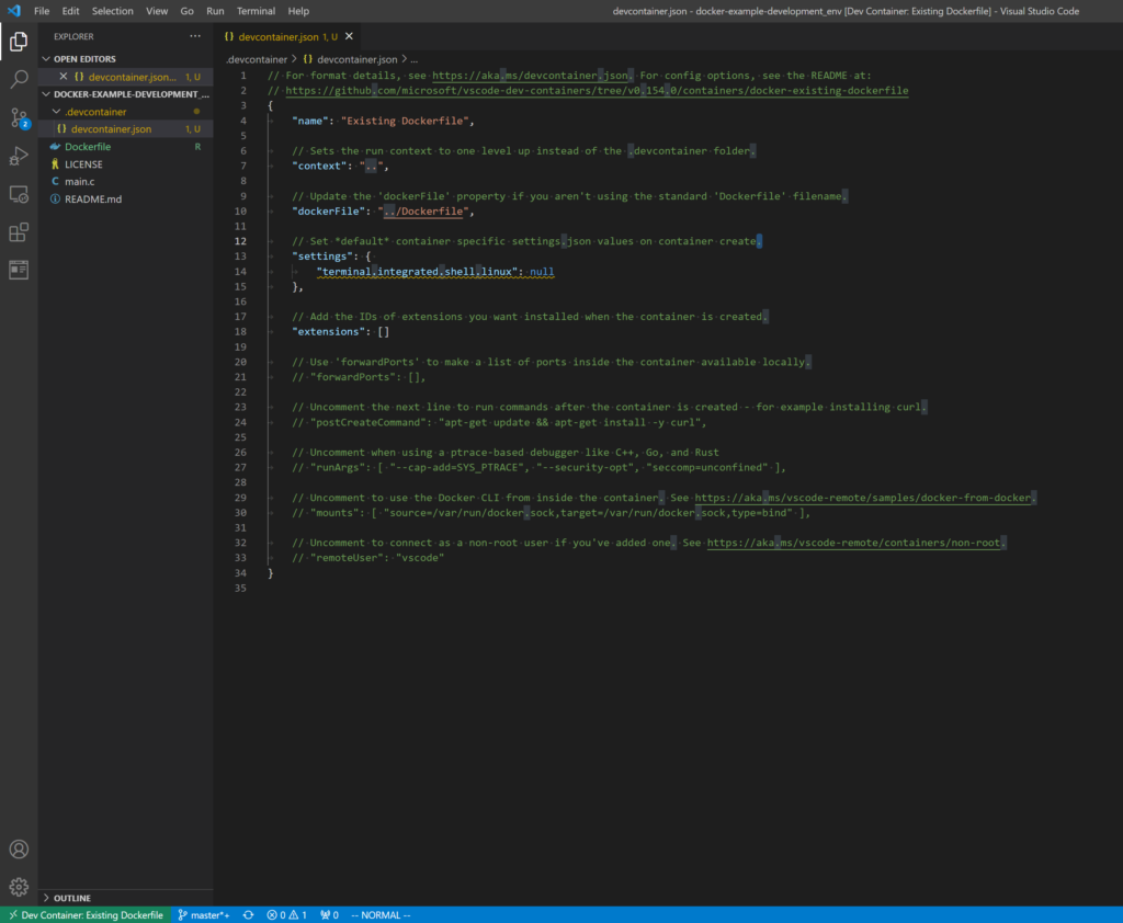 .devcontainer”目录,这个目录是用来存放vscode关于remote-container的配置的,建议一并提交到代码仓库中,这样可以共享关于此项目的vscode的配置。 - 进入容器的开发环境后,编辑器的左下角有一个“Dev Container: Existing Dockerfile”的标识。