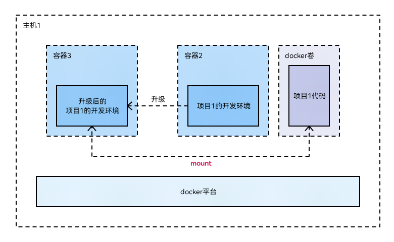 再仔细看“主机1”的内部结构可以看到,这里是将容器和代码进行分离的,这样的好处在于容器和代码可以分开管理,比如当我们决定更新开发环境时,不必担心代码也会被删除,因此可以在不影响代码的情况下升级开发环境,在升级完成后再将代码mount到新的容器(新的开发环境)中即可,如下所示: