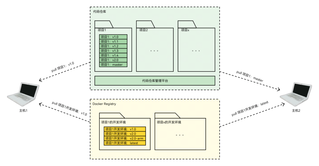 如上所示,主机1拉取“项目1:v1.0”的代码及适配的“项目1开发环境:v1.0”的镜像进行v1.0的编译或开发工作。而主机2则拉取“项目1:master”的代码及适配的“项目1开发环境:latest”的镜像进行master的编译或开发工作。