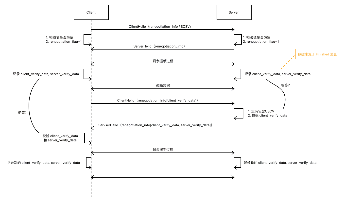 当客户端准备发起重协商时,它会在ClientHello中携带renegotiation_info扩展,值为client_verify_data,服务器收到后必须确保: