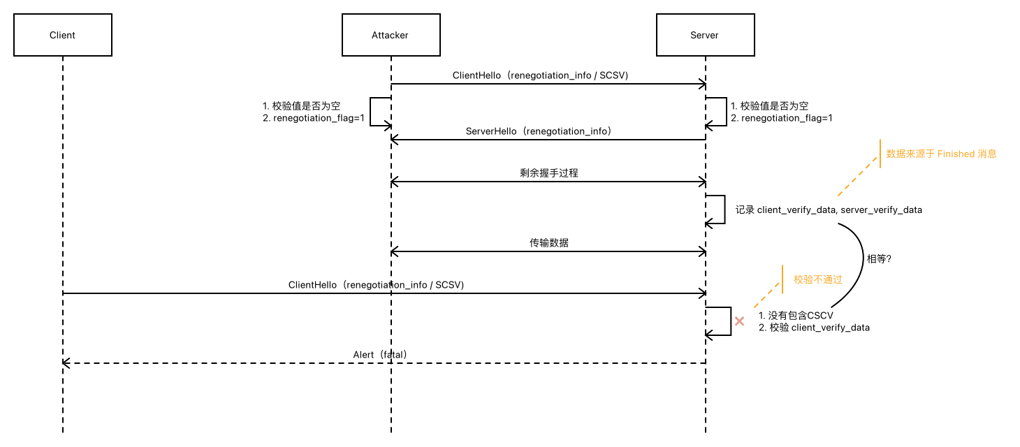 ClientHello必须确保没有TLS_EMPTY_RENEGOTIATION_INFO_SCSV,如果有就必须返回一个fatal_alert。 - 服务器必须确保客户端扩展包含一个