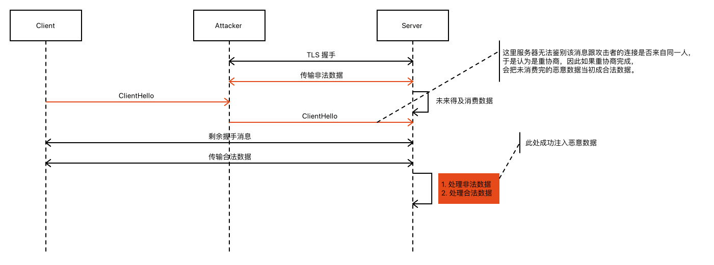 重协商的漏洞的根本原因是,重协商的消息没有跟已经建立的TLS连接绑定,因此服务器无法鉴别ClinetHello是否来自真实客户端的,会误以为是客户端发起的重协商,从而导致中间人攻击。其攻击过程大致如下: