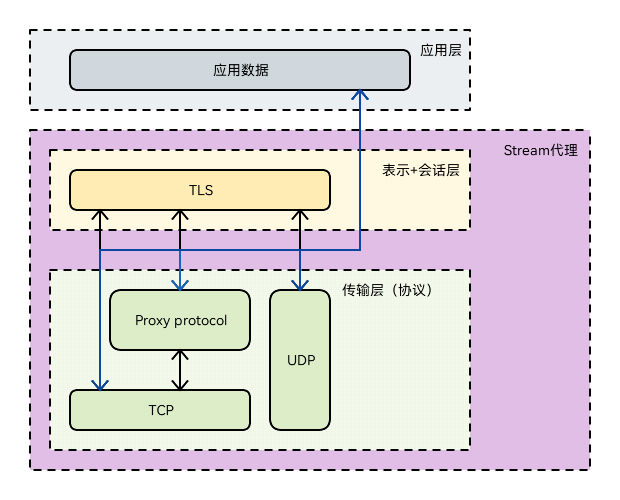 Stream业务,即流代理。其代理应用层以下的业务流量,是应用代理能力的补充。最直接就是传输层的TCP和UDP代理,同时也支持“Proxy protocol”(v1和v2)。如何理解流代理,最简约的表达就是“传输层”代理,不考虑数据的应用特征,只进行数据代理/转发,同时在需要时提供“会话层”和“表示层”的支撑,比如TLS加密,这也是源生Nginx的“Stream代理”中携带的能力,基于此思想,我们也能在需要的时候去扩展其“传输能力”、“会话能力”和“表示能力”,完成自身的定制化开发。其协议栈如下所示: