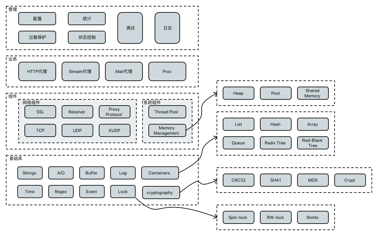 首先从体系结构开始,Nginx可以大致可以分为4个部分,分别为“管理”、“业务”、“组件”和“基础库”,如下所示: