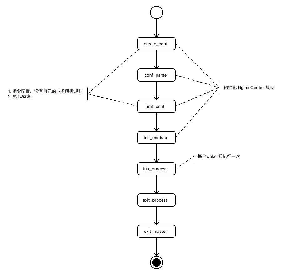 该上下文是静态的,即在程序从启动进入到就绪状态后就确定了,它主要由配置决定。Nginx对启动过程有明确的定义,分为以下几个过程: