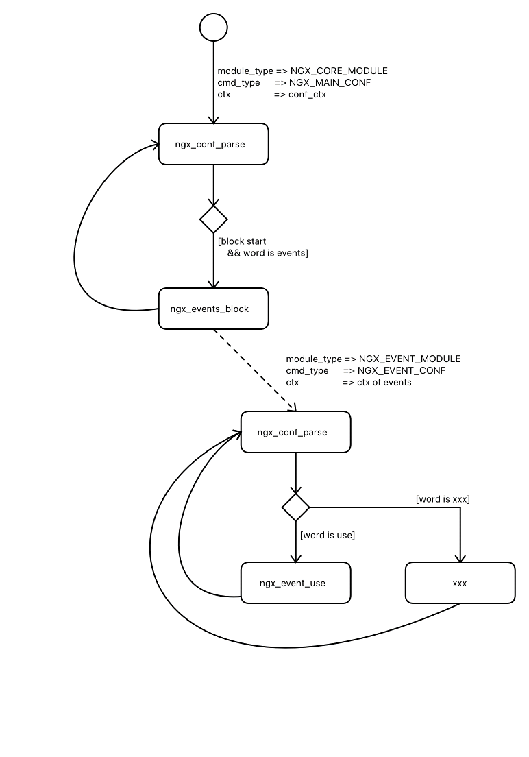 ngx_events_block:static char * ngx_events_block(ngx_conf_t *cf, ngx_command_t *cmd, void *conf) { void ***ctx; // 省略... // 1. 创建 events 的配置上下文 ctx = ngx_pcalloc(cf->pool, sizeof(void *)); if (ctx == NULL) { return NGX_CONF_ERROR; } *ctx = ngx_pcalloc(cf->pool, ngx_event_max_module * sizeof(void *)); if (*ctx == NULL) { return NGX_CONF_ERROR; } *(void **) conf = ctx; // 2. 将上下文更新到 配置指针 中 // 省略... // 调用配置解析 pcf = *cf; // 3. 保存原有的配置上下文 cf->ctx = ctx; // 4. 设置上下文 cf->module_type = NGX_EVENT_MODULE; // 5. 设置模块类型 cf->cmd_type = NGX_EVENT_CONF; // 6. 设置命令位置 rv = ngx_conf_parse(cf, NULL); // 7. 调用配置解析 *cf = pcf; // 8. 回复原有的配置上下文 }- 在第7步的时候,会嵌套调用