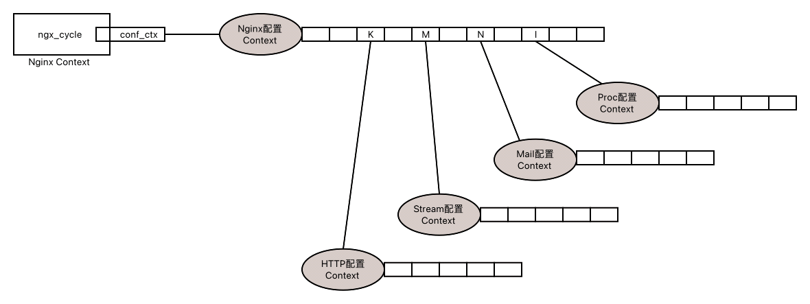 如上图所示,我们变更了名字以更符合其定义,即将“xxx框架 Context”改为“xxx配置 Context”。“Nginx Context”的第K位置指向的是“HTTP配置 Context”,M指向“Stream配置 Context”,N指向“Mail配置 Context”,I指向“Proc配置 Context”。最终每个业务的上下文还会有自己的“Context 数组”去存储各自业务模块的配置上下文。而ngx_cycle除此之外还有很多全局的属性存在,因此在程序运行的任何时候,都可以通过它去获取想要的数据。