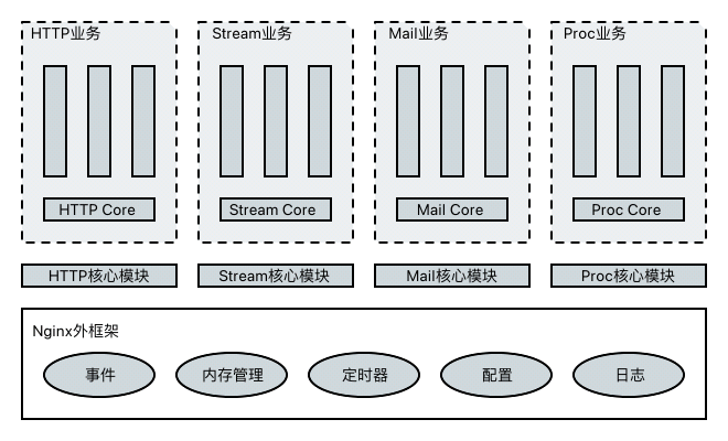 从上图不难看出,每种业务和Nginx外框架之间都存在一个“核心模块”,该模块是业务框架与Nginx外框架的桥梁,它负责定义业务的配置解析规则、模块以及框架,并将自身的业务注册到Nginx中,可以这么说,有了这一层设计后,既可以保证业务与框架的隔离,也能保证业务的扩展性。