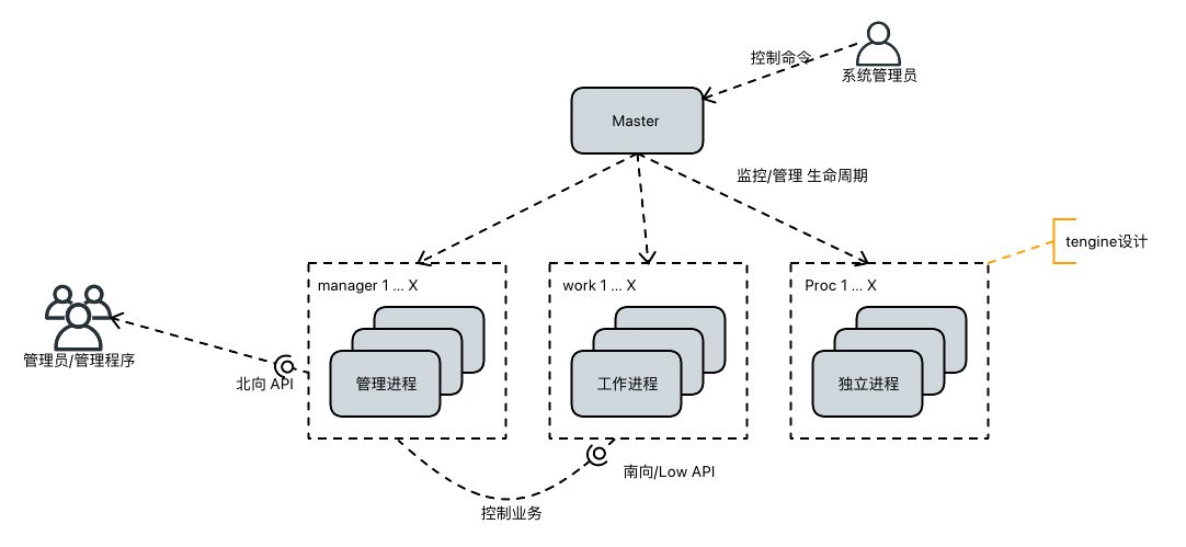 管理进程:控制面程序,向上提供北向管理接口,向下负责控制“工作进程”如何处理业务。