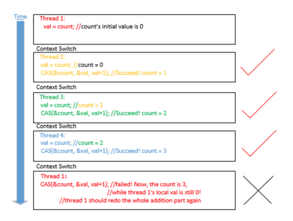 lock-free示例代码:#include <stdio.h> #include <stdatomic.h> #include <pthread.h> static void * adding(void *input); int count = 0; int main() { pthread_t tid[10]; for(int i = 0; i < 10; i++) { pthread_create(&tid[i], NULL, adding, NULL); } for(int i = 0; i < 10; i++) { pthread_join(tid[i], NULL); } printf("the value of count is %d\n", count); } static void * adding(void *input) { int val; for(int i = 0; i < 1000000; i++) { do { val = count; } while (!atomic_compare_exchange_weak(&count, &val, val+1)); } pthread_exit(NULL); }-