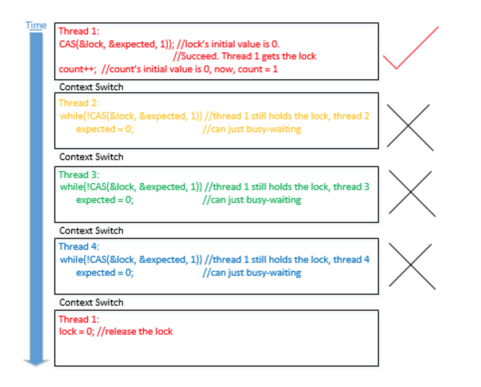 spin-lock示例代码:#include <stdio.h> #include <stdatomic.h> #include <pthread.h> static void * adding(void *input); int count = 0; int lock = 0; int main() { pthread_t tid[10]; for(int i=0; i<10; i++) { pthread_create(&tid[i], NULL, adding, NULL); } for(int i=0; i<10; i++) { pthread_join(tid[i], NULL); } printf("the value of count is %d\n", count); } static void * adding(void *input) { int expected = 0; for(int i = 0; i < 1000000; i++) { // if the lock is 0(unlock), then set it to 1(lock) while(!atomic_compare_exchange_weak(&lock, &expected, 1)) { /* * if the CAS fails, the expected will be set to 1, * so we need to change it to 0 again. */ expected = 0; } count++; lock = 0; } }-