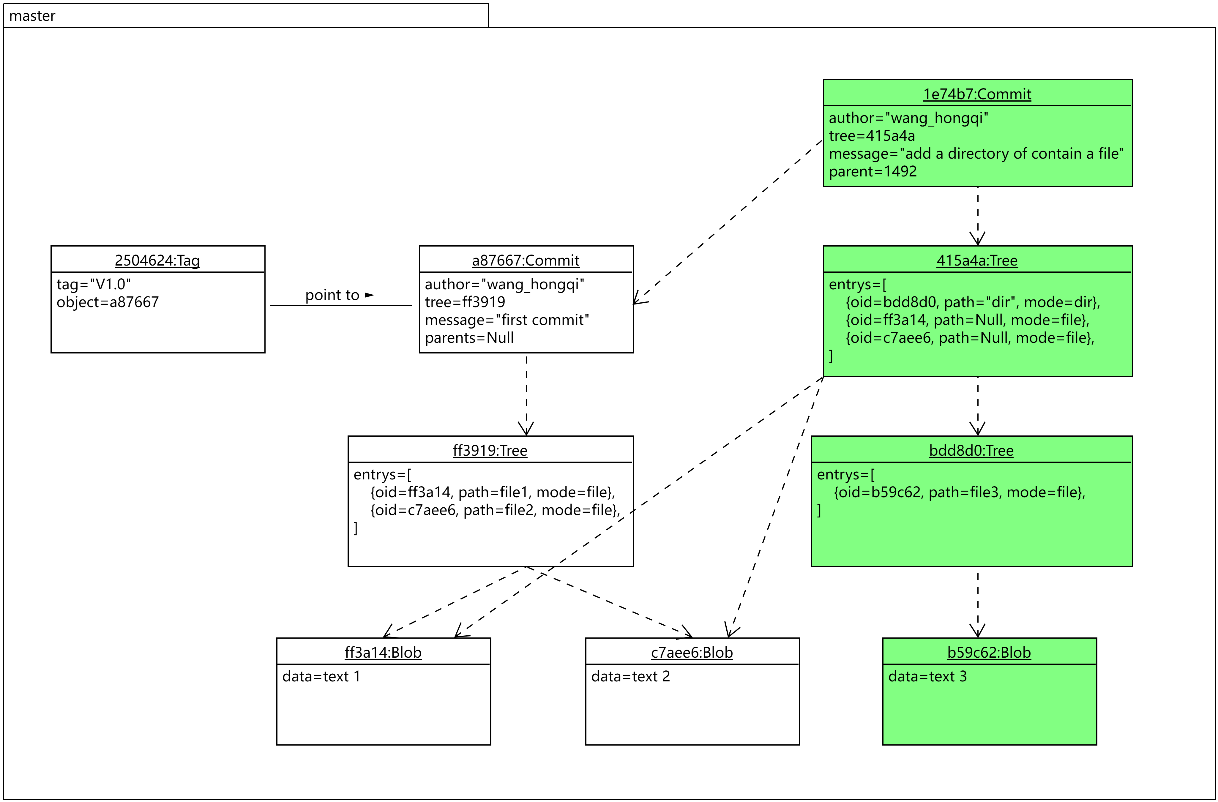 tag):一个tag对象分配一个任意的且人类可读的名字给一个特定对象,通常是一个commit对象。