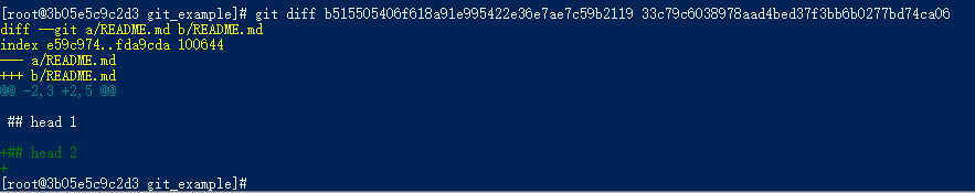 git show命令查看:git show # commit 33c79c6038978aad4bed37f3bb6b0277bd74ca06 (HEAD -> master) # Author: homqyy <homqyy@example.com> # Date: Wed Aug 3 15:40:07 2022 +0000 # # add head 2 # # diff --git a/README.md b/README.md # index e59c974..fda9cda 100644 # --- a/README.md # +++ b/README.md # @@ -2,3 +2,5 @@ # # ## head 1 # # +## head 2 # +- 查看特定提交的信息: