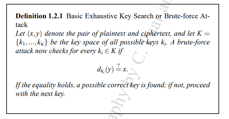 假设 \((x,y)\) 表示一对明文和密文对,\(K=\{k_{1},...,k_k\}\) 表示所有可能的密钥 \(k_i\) 组成的密钥空间。蛮力攻击将检查每个\(k_{i} \in K\),判断以下条件是否满足: