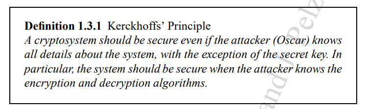 - 可靠的密码体制必须遵守 Auguste Kerckhoffs 在1883年提出的一个假设,即“Kerckhoffs原理”。