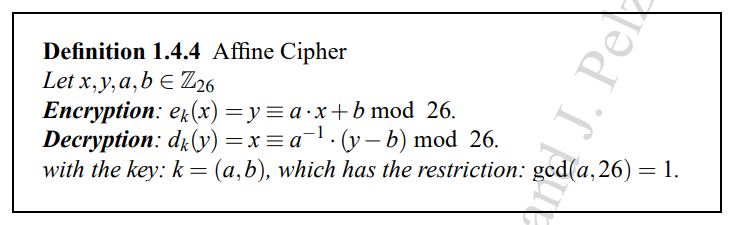 所以,只需要能够知道两对明文和密文对即可获得两个方程,并得到A与B的解: