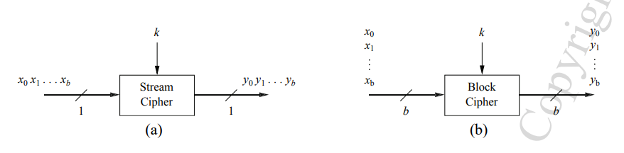 - 从图中可以看出,序列密码是1位1密,分组密码则是安组加密,图中的组宽度为b。