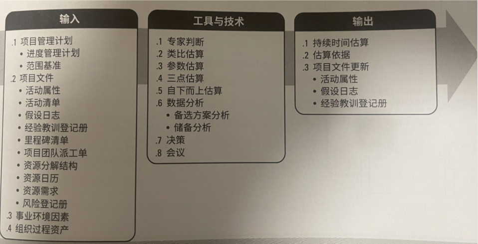 作用:确定完成每个活动所需花费的时间量,本过程在整个项目期间展开。